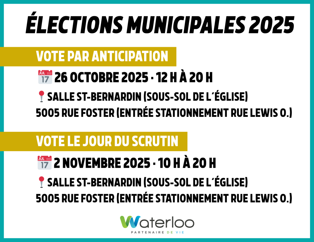 Les élections municipales sont un moment important pour la démocratie locale. Tous les quatre ans, les électrices et les électeurs de la ville de Waterloo sont invités à se présenter aux urnes pour élire des conseillères et des conseillers municipaux et une mairesse ou un maire qui les représenteront.